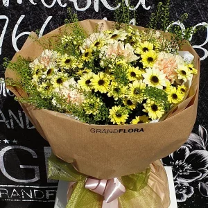 Солнечные объятия - букет из желтых хризантем и гвоздик